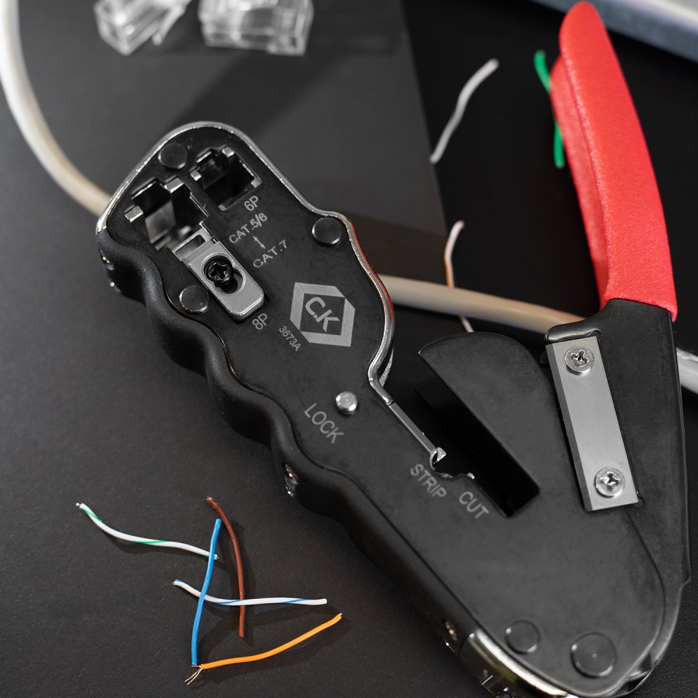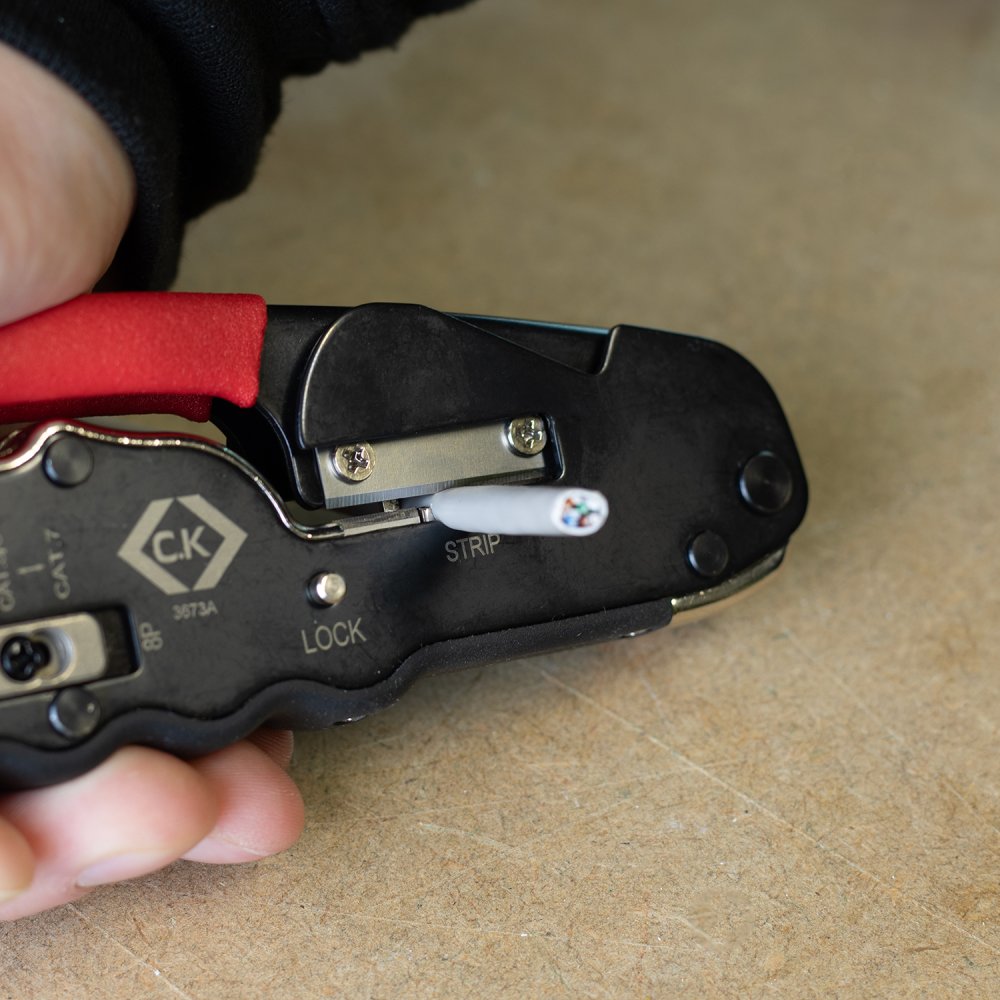 - Cuts and strips CAT3, CAT5e, CAT6 and flat cables