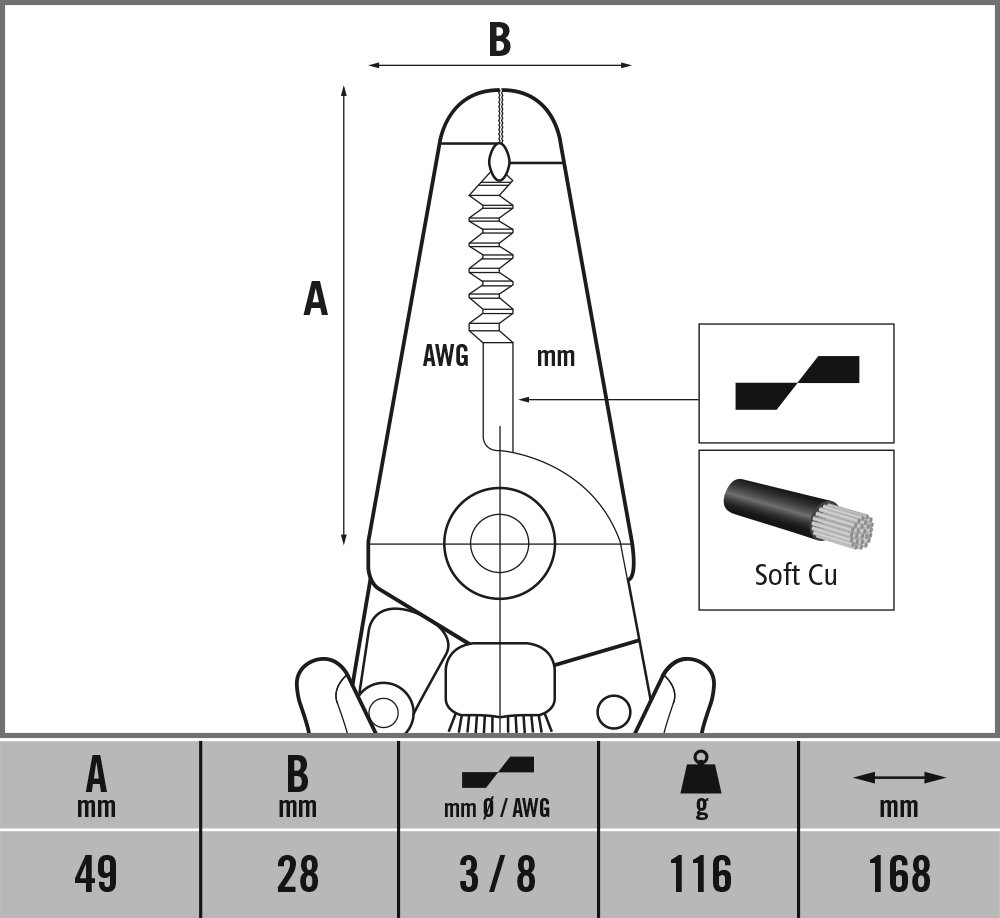 - Integrated shears for cutting soft copper wires up to 3mm Ø / 8AWG Stranded.
